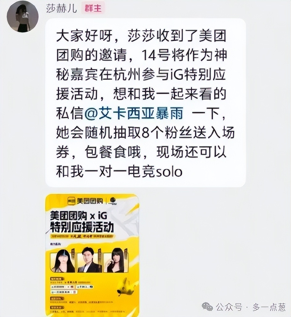 事情是这样子的,美团赞助了IG成为IG的赞助商之一。因为IG和T1的这场附加赛即将开打,所以在赛前各方也都在进行预热,作为新赞助商的美团,自然而然也为IG发起了特别的应援活动。这个应援活动就是美团联合IG发起的线下观赛邀请嘉宾,助力嘉宾一共有三位,公布了两名嘉宾,分别是小伞和树奈奈,还有一位是神秘嘉宾。后来这名神秘嘉宾被粉丝扒出来是女版Faker莎赫儿,这一下子就让IG粉丝和Faker粉丝坐不住了。
