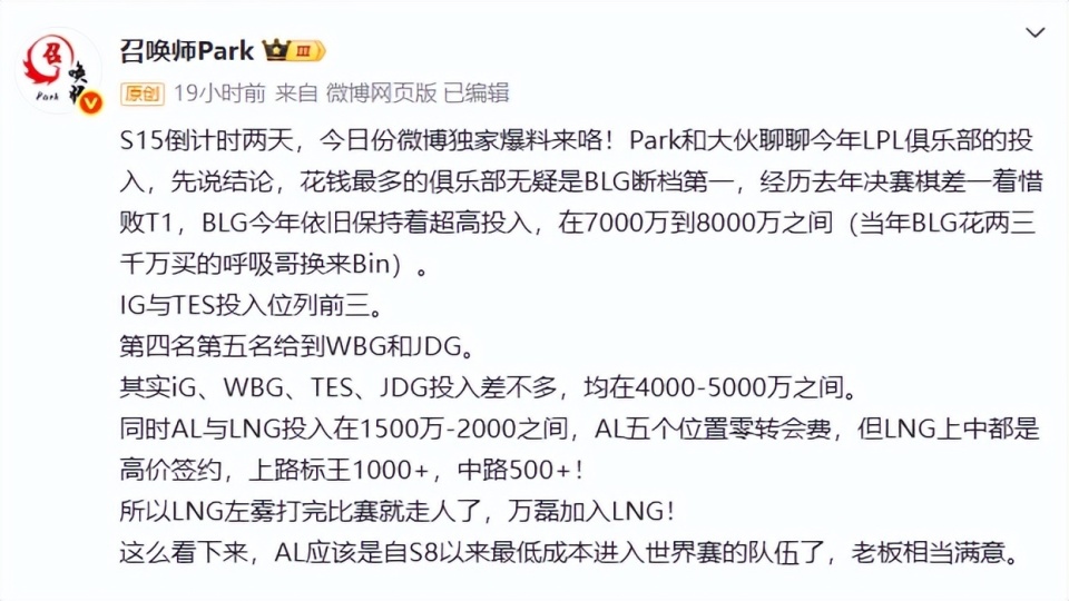 LOL博主Park,在近日发文爆料了LPL各大战队,今年阵容的总投资,BLG以7000-8000万的投入,断档领先排在第一,紧接着就是IG和滔搏,这两队都排在前三,京东和微博的投入,跟IG、滔搏差距不大,都在4000-5000万之间,另外LNG和AL投资相仿,两队都是1500-2000万左右。