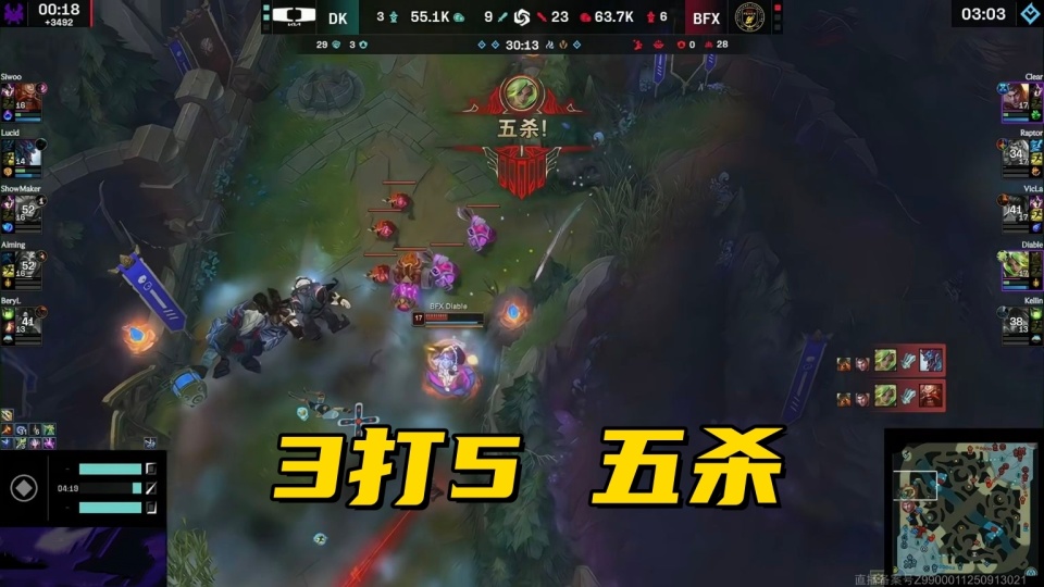 从决赛的第四局,就能看得出来,Diable也是个大心脏选手,最后一波决胜团,打野给机会被开,中路也跟着送了,BFX在3打5的情况下,AD疯狂操作,直接砍下了一波五杀,BFX顺势一波推平DK基地,要是Diable没站出来,DK大概率翻盘了,因为BFX的阵容,后期是没有DK强的。