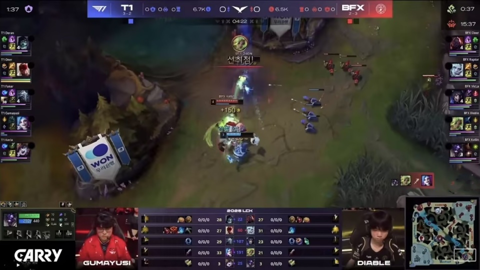 其实早在第二赛段的时候,Diable就已经崭露头角了,那时候T1还在搞AD轮换,Smash对线被Diable线杀打爆之后,T1换上小吕布,结果大鸡蛋也被Diable线杀,最后T1输给BFX,另外BFX在交手GEN的时候,虽然大场输了,但也赢一小局,Diable在那场比赛里,对位把尺帝打成了0-6。