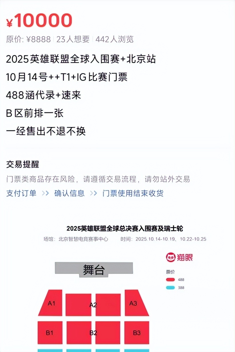 明天(10月14日),在中国举办的英雄联盟2025全球总决赛入围赛将迎来焦点对决——中国LPL赛区IG战队迎战韩国LCK赛区老牌劲旅T1,这场本属资格赛阶段的较量,热度已飙升至决赛级别。原价388元和488元的赛事门票在闲鱼等二手平台遭黄牛爆炒,最高报价突破1万元,溢价超20倍,开赛前夕“IG vs T1 门票溢价”“S 赛入围赛变修罗场”等相关话题已持续霸榜社交平台热搜。