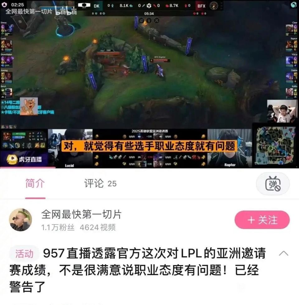 2025年亚洲邀请赛成为压垮LPL的“最后一根稻草”。LCK赛区战队包揽赛事前三名,而LPL仅有WBG一支队伍闯入淘汰赛,JDG、NIP等队伍甚至在小组赛阶段便遭淘汰。更令人难以接受的是,部分LPL选手对待比赛的态度极其敷衍,有爆料称,一些选手因赛事占用休息时间而消极应对,既不认真备战,也不赛后复盘。
