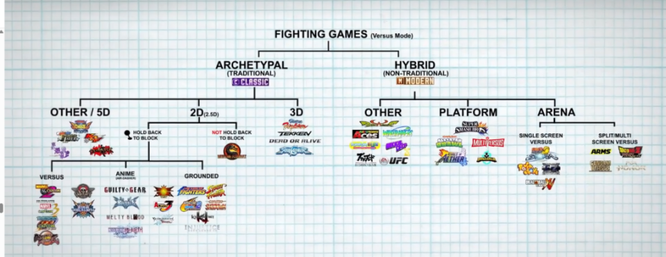 这里参考油管博主Core-A Gaming对FTG的分类,将FTG分为传统格斗游戏和现代格斗游戏。其中传统格斗游戏分为2D、3D和其他,2D即为以《街霸》系列、《罪恶装备》系列为代表的横板格斗,3D则是《VR战士》系列和《铁拳》系列为代表的在2D格斗基础上加入侧向移动的格斗。在传统FTG中,视角通常锁定为侧面视角。