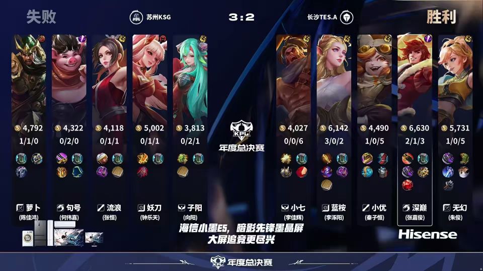 最后一局KSG虽然赢了但是很离谱,早早就领先了六七千经济,也推掉了三路高地。但推水晶时子阳开团着急了,只有句号能跟,伤害不够,反而是妖刀没人保被深巅切死了,句号位置太深也被蚩奼击杀,TES一波零换二守了下来。