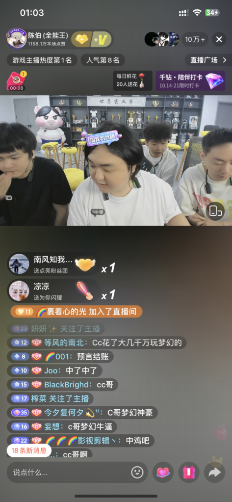 很长一段时间的直播间节奏飞起,然后宝哥也语重心长的说你们别带节奏了,再带他直播都没有朋友了,那个点直播的大主播跟宝哥有过交集的直播间都有人在刷屏,宝哥再喊你打梦幻!