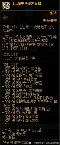 注意:①[活动]史诗终末令牌,只有完成115所有主线任务和深渊:终末之边界相关任务,才可以使用该道具,勇士们要抓紧啦!