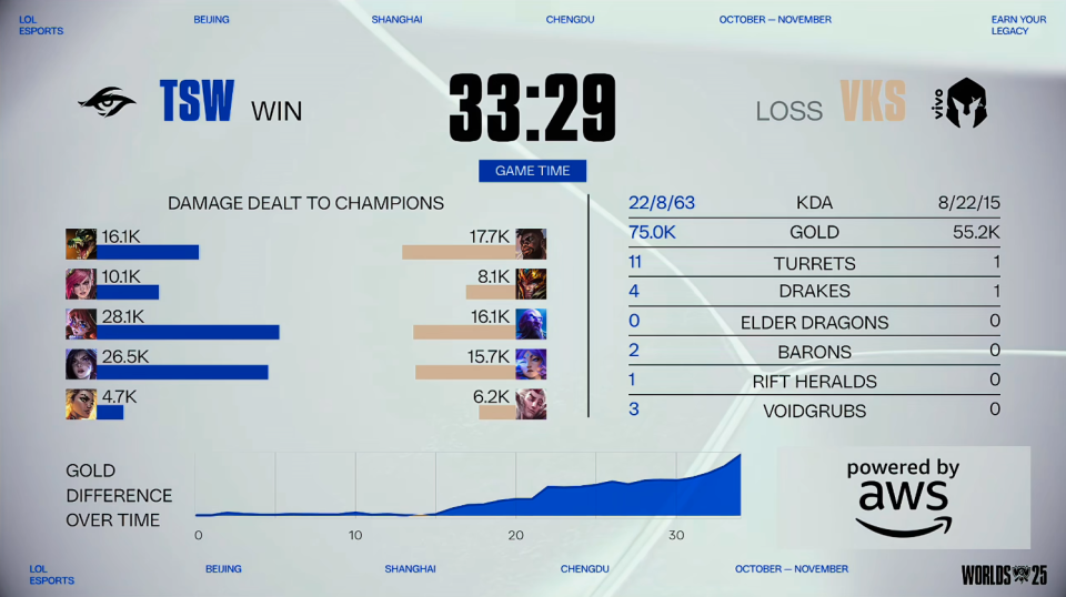 结果第一局比赛,双方在前15分钟,打得比较激烈,经济一直咬住不放,但是到了后期,TSW就展现出实力,拿下比赛。1分钟左右:VKS一级入侵野区,双方爆发激烈一级团TSW防守成功击杀两人;10分钟左右:上路多人集结,Boal奎桑提闪现大招击杀一人双方最终打出2换2;16分钟左右:蔚成功抢下先锋,随后团战TSW大获全胜打出1换5;21分钟左右:VKS伤害欠缺,TSW果断开团打出0换5控下厄塔汗;25分钟左右:中路果断开团TSW再次打出1换3,随后顺利控下大龙;最终33分29秒:TSW高地果断开团再次打出0换5,成功终结比赛拿下胜利