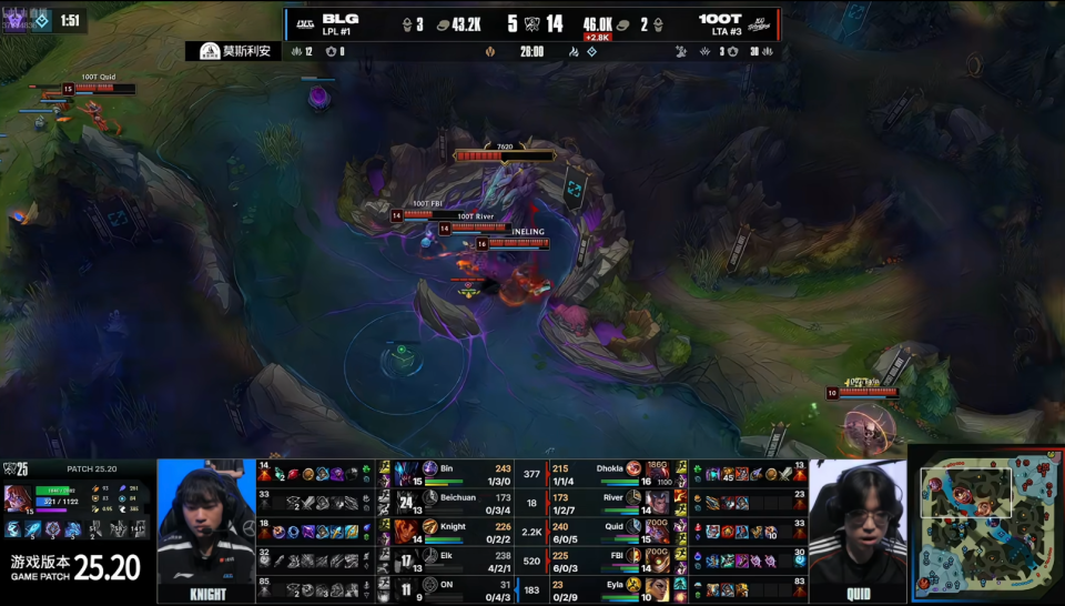 25分钟双方野区混战,Quid阿萝拉击杀ELK女警,100T打出0换3后,拿下第一条大龙。之后Knight岩雀上路带线又被抓死。27分钟100T中路抓ELK女警,ELK成功逃生,北川皇子被留住再次被击杀。28分钟北川皇子反野再次被抓死,100T则是拿下听牌龙。后期30分钟ELK女警野区被抓死,随后100T追击,BLG被迫反打,但是伤害不足,100T打出1换5团灭BLG后,拿下比赛的胜利。