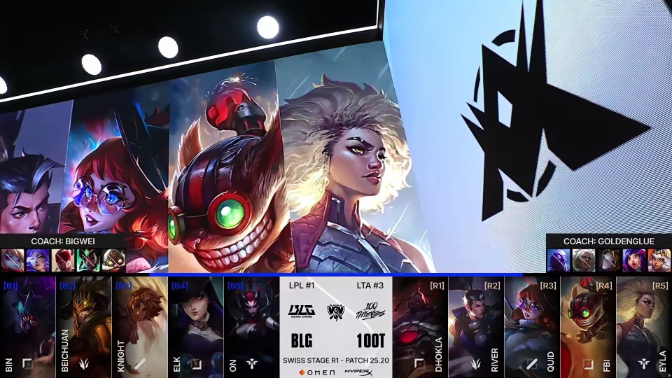 BLG这边ban了波比、芸阿娜、盲僧、扇子妈和飞机,选择了上单挖掘机,打野皇子,中单岩雀,下路女警加蜘蛛;100T这边ban了瑞兹、安蓓萨、发条、妮蔻和琪亚娜,选择了上单赛恩,打野赵信,中单阿萝拉,下路炸弹人加芮尔。
