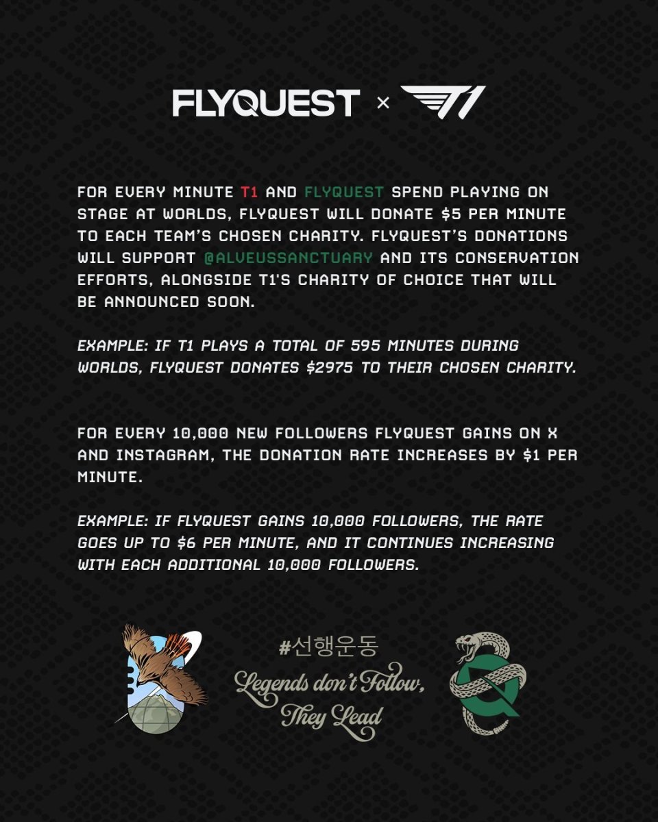 世界赛期间两队比赛时长每一分钟,就会向各自队伍选择的慈善机构捐赠 5 美元!FlyQuest的善款将用于支持野生动物保护工作,以及 T1 即将宣布的慈善机构选择。