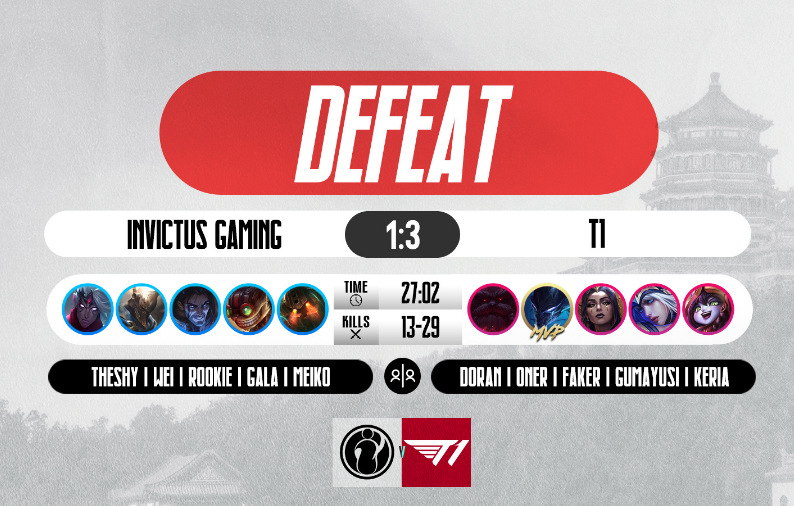 那波关键龙团前,Wei选择强行Q下龙坑去排眼,试图为队伍争夺视野,然而这一举动被T1敏锐捕捉,瞬间开大反打,Wei还没来得及逃脱,就被围剿击杀,失去了打野的IG无法争夺小龙,T1趁势逼团,一波完美开团将IG打得溃不成军。