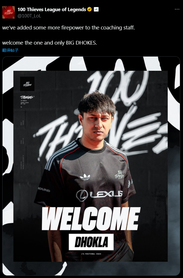 而且他们的上单Dhokla,年龄上比对位的bin大了整整7岁,在2023年效力NRG的时候拿到了夏季赛的冠军,2024年一度因为没队伍要,只能去LEC的次级联赛讨生活,在欧洲颠沛流离半年后,以教练身份加入100T,后来因为救火,转成上单加入首发大名单。