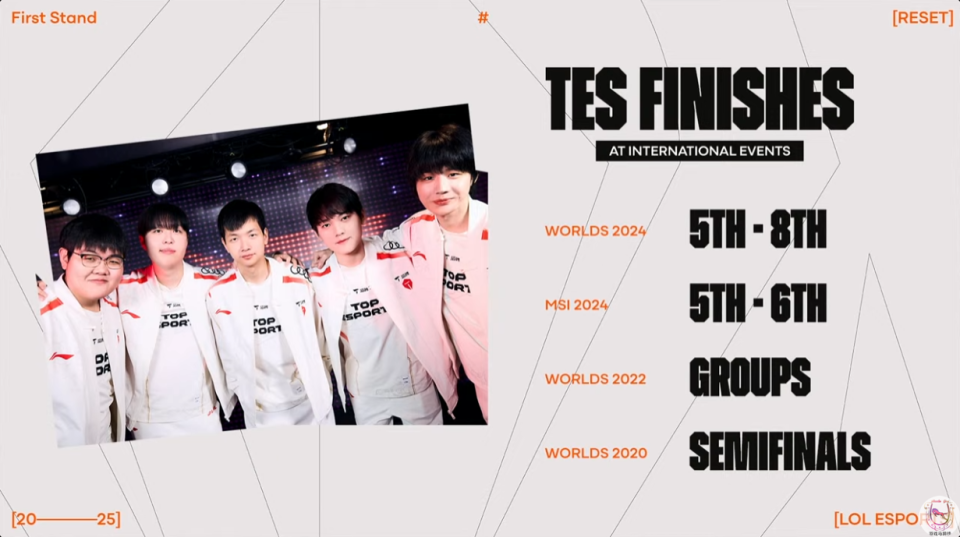 TES本赛季先锋赛对战韩国队HLE的战绩是0-5,季中赛MSI和世界杯EWC没资格参加,全球总决赛前两轮都是对战欧美的好签,结果晋级赛遇到韩国队KT,再次被打出0-2。截止到今天,TES本赛季对战韩国队是0-7,一小局没赢。而且对手KT也是运气队,先后抽签欧洲和越南,最后虐了TES晋级八强。