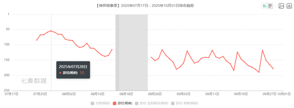 《伊瑟》的国际服于6月上线,短期表现不错,首月吸金在6000万以上。国服版9月25日上线后,整体表现可圈可点,据七麦数据显示,游戏在上线首日曾短暂登顶AppStore游戏免费榜,AppStore游戏畅销榜最高冲到了第26位,而后游戏双榜排名皆出现下滑,免费榜下滑到了300名开外,畅销榜目前滑落至第80位左右,有些显露疲态。