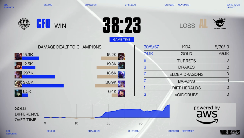 中期CFO主动打厄塔汗,TES赶来后混战,HongQ阿萝拉开4人,shanks瑞兹想要绕后自己反被击杀,CFO击杀AL四人后,拿下厄塔汗。后期30分钟CFO主动打大龙,Tarzan大树闪现抢下第一条大龙,不过团战AL还是溃败,HongQ阿萝拉收割,CFO打出3换5团灭AL,随后拿下听牌龙。最终37分钟AL中路开团,没能击杀Doggo飞机,CFO上单赛恩大招直接开到hope芸阿娜,将其击杀,CFO团灭AL后,拿下第一局的胜利。首局伤害最高的是Doggo飞机,AL这边伤害最高的是hope芸阿娜。