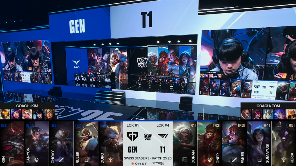 第一局比赛,GEN蓝色方,禁用:巴德、妮蔻、奇亚娜、女警、希维尔,选用:Kiin塞恩、Canyon赵信、Chovy发条、Ruler飞机、Duro波比;T1红色方,禁用:沙皇、芸阿娜、加里奥、霞、卢锡安,选用:Doran安蓓萨、Oner猴子、Faker阿萝拉、Gumayusi卡莎、Keria牛头