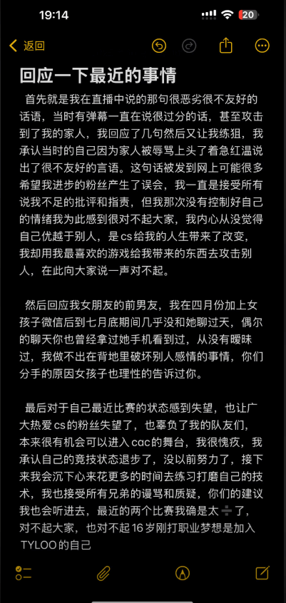 “首先,我在直播中说的那句很恶劣、很不友好的话,是因为当时弹幕有人不断说过分的话,甚至辱骂我的家人,我才情绪失控、上头回应。那句话被发到网上,可能让很多真心希望我进步的粉丝误会了我。我一直都接受批评和指责,但那次没控制好自己的情绪,为此我向大家道歉。我从没觉得自己比别人优越,是《CS》改变了我的人生,而我却因为冲动,用这款让我热爱的游戏带来的荣誉去伤害别人,对不起大家。”