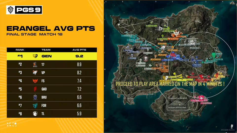 阶段6圈形刷新,满编的TWIS占住圈内的唯一房区,这下不仅能夺冠,最后还能给他们来一把纯爽局,NAVI冲到BGP脸上瞬间团灭,FS也是一波刷屏被TWIS秒了,这样FS和4AM同分排在前六。剩下的残局基本没什么可看的,TWIS抢下GEN的分数后再淘汰掉BGP,吃下PGS9决赛的最后一鸡,这真给他们爽到了。