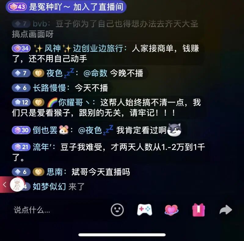 然后串子就开始了,因为很多人是觉得咖啡豆真的是走了狗屎运能成为宝哥的管家,人人都觉得他德不配位,但是人人又想成为他,现在看他直播间人气不高就开始两边带节奏,说麻包包直播间破万了,哎呀,豆总怎么从1-2万变成1千人了?