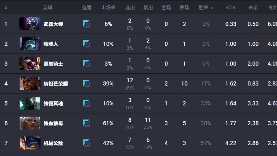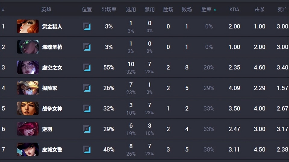 下路的EZ、卡莎,都像是版本陷阱,卡莎登场11次,胜率只有18%,差点就跟奎桑提坐一桌了,EZ的胜率也只有28%,感觉小吕布挺应该挺开心,这两个英雄,他都不擅长,正好现在可以不用玩了,下路胜率最高的英雄,是飞机、卢锡安、芸阿娜,这三个英雄胜率,都在76%-71%左右。