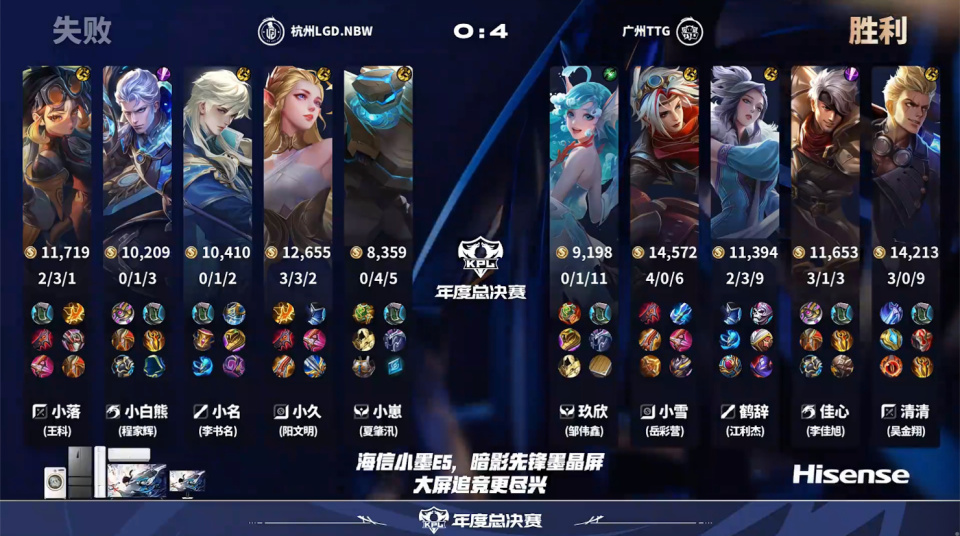 LGD守高地的情况下小落的蚩奼绕后,清清一直在后面盯着,小落根本没机会切进来。逼得LGD没办法,盾山和艾琳也进了人堆,但也只击杀了朵莉亚。清清处理完小落回头打小久,LGD射辅全倒,只剩下小白熊和小名已经无力防守,TTG4-0横扫晋级下一轮。