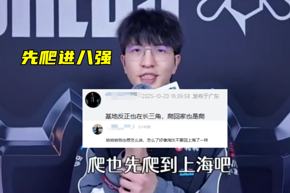 对此,ELK在受访时也是给粉丝留了一句话:我们之后的所有比赛都会好好打,不管怎么样,爬也要先爬到上海吧,上海见!这里和大家解释一下,此次八强赛的举办地点是上海,所以ELK的意思是“爬也要爬进八强”,另外,他也是给滔搏送去了祝福,希望LPL的队伍都能上海见。然而角度刁钻的玩家们却调侃起了ELK:BLG的基地不也在长三角?怎么,输了被淘汰了就不回上海了?