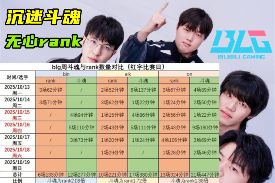 在此次S15的舞台上,由于BLG成绩不佳,甚至输给了100T。因此,不少玩家对他们的要求也是愈发严格了起来,开始逐字分析BLG的采访,并且对于选手的比赛表现,也是一点细节都不放过。更有玩家认为BLG状态这么差,与他们的训练赛肯定有着极大的关系,便开始统计起了BLG全员的rank记录,这一查可就查出问题了,BLG的首发三人,Bin、Elk以及ON近期沉迷斗魂竞技场,无心rank训练。