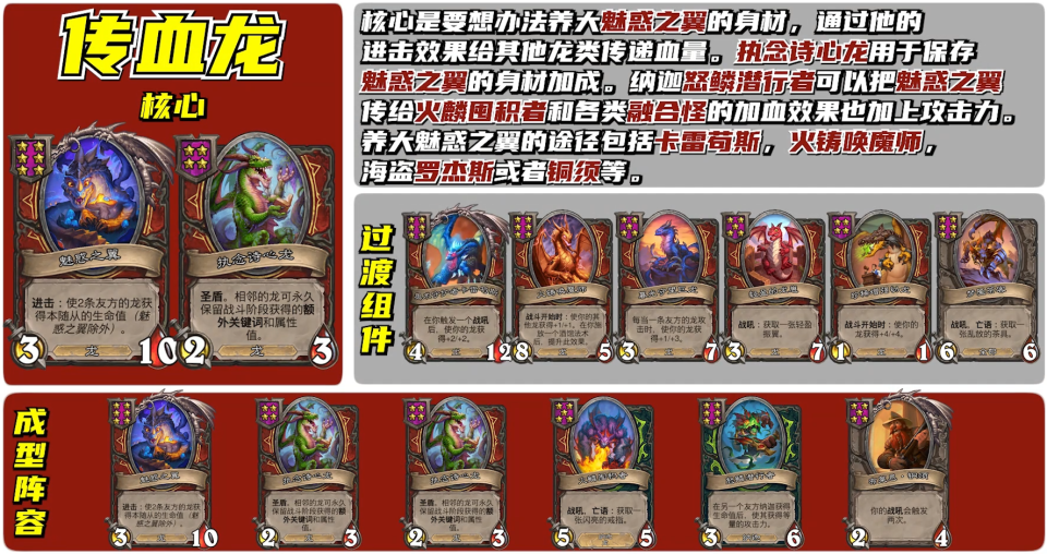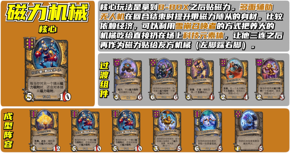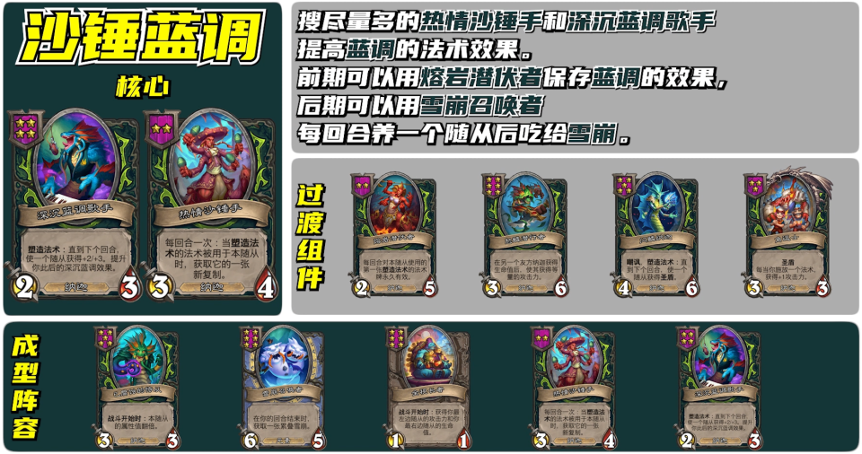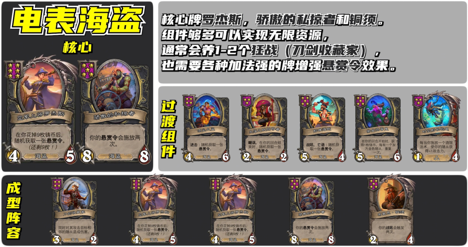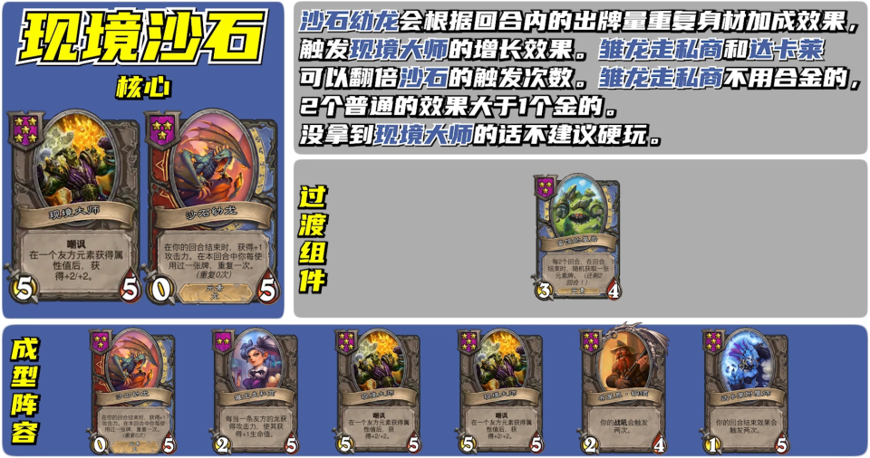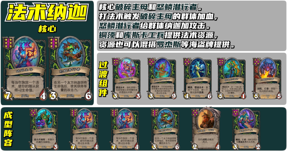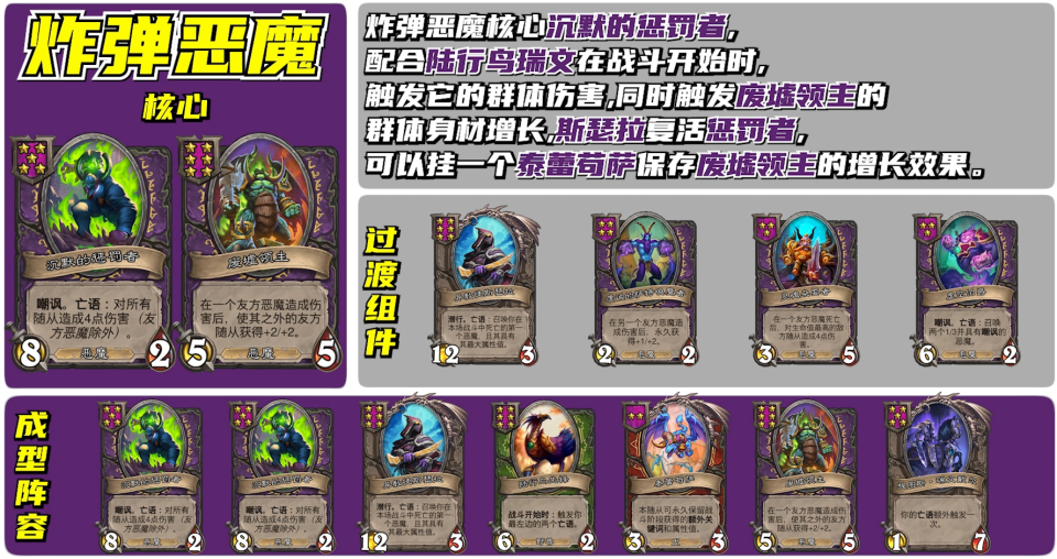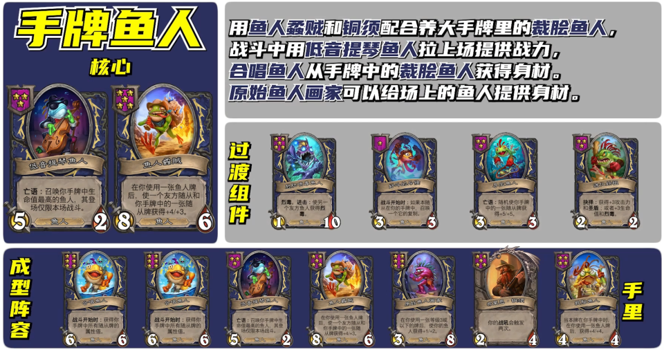 目前环境中最强的两大流派分别是挂机鱼人和炸弹恶魔。挂机鱼人核心魔鳍真菌学家,登场后购买群体加身材的酒馆法术得到魔鳍学徒,配合小瞎眼,铜须,达卡莱在回合结束时重复触发学徒的效果,邪火咒龙提升法强。炸弹恶魔核心沉默的惩罚者,配合陆行鸟、 瑞文在战斗开始时触发它的群体伤害,同时触发废墟领主的群体身材增长,斯瑟拉复活惩罚者。可以挂一个泰蕾苟萨保存废墟领主的增长效果。海盗主要是电表倒转流,核心牌罗杰斯,骄傲的私掠者和铜须。组件够多可以实现无限资源,通常会养1-2个狂战,也需要各种加法强的牌增强悬赏令效果。纯海盗阵容的身材增长效率不高,因此电表海盗通常会搭配其他流派的组件形成混搭流,例如搭配破碎主母的电表纳迦实现群体加血,搭配龙体系养大魅惑之翼进行传血,搭配暗视长者和鲁古格形成电表猪,搭配救赎者娜拉或者噬月者的勇士形成中立法茶或者奇茶,搭配贪食的乌祖尔形成吞食恶魔流。野兽主要有3种。进击野兽上限比较高但是成型比较困难。核心重踏剑龙和护巢机。剑龙给全体野兽加上进击效果,中间的魔刃豹,机械木马等野兽提供亡语频率,触发后置位护巢机的复仇效果进行攻击。第2种是钻地虫亡语流。需要在中前期给钻地虫叠复仇增强它的亡语效果,亡语效果够高了以后,用鹦鹉,陆行鸟和瑞文触发它的群体BUFF能力。第3种是巨狼亡语流。玩法类似钻地虫,但狼爹不需要养,成型快一些但上限要比钻地虫低,可以作为阵容过渡的流派。同样是用鹦鹉,陆行鸟,瑞文触发巨狼戈德林亡语的群体BUFF。鹦鹉+陆行鸟+瑞文这亡语三件套除了配合本家野兽,还能配合其他流派的亡语随从。比如前文提过的炸弹恶魔。还能配合海盗的舰长尤朵拉,配合纳迦的显眼的骑手形成亡语纳迦,配合亡灵的遗骸看管者和古墓捣蛋鬼形成亡灵挤爆流。纳迦目前可玩的阵容有4套。一套是刚提到的亡语纳迦,核心显眼的骑手,亡语可以给全体纳迦加身材,但需要打法术养他的亡语效果,阵容上限不算高。更常见的是法术纳迦流,核心破碎主母和怒鳞潜行者。打法术触发破碎主母的群体加血,怒鳞潜行者给群体纳迦加攻击。已腐蚀的侍从让身材收益加倍。铜须和库斯卡工兵提供法术资源,资源也可以混搭罗杰斯等海盗牌提供。沙锤蓝调也是纳迦的常见玩法,搜尽量多的热情沙锤手和深沉蓝调歌手提高蓝调的法术效果。前期可以用熔岩潜伏者保存蓝调的效果,后期可以用雪崩召唤者每回合养一个随从后吃给雪崩。挂机纳迦的核心是动物低语者,每回合结束时给群体纳迦打自然祝福提升身材,怒鳞潜行者提供群体加攻,邪火咒龙和宁静的冥想者提供法强,达卡莱附魔师倍增各类挂机效果。鱼人最强的流派是视频开头提过的挂机鱼流派。除此之外还可以玩手牌鱼,用鱼人蟊贼和铜须配合养大手牌里的裁脍鱼人,战斗中用低音提琴鱼人拉上场提供战力,合唱鱼人从手牌中的裁脍鱼人获得身材。原始鱼人画家可以给场上的鱼人提供身材。鱼人还可以组下毒阵容。核心怒胆喷毒鱼人,本身具有烈毒效果并且给别的鱼人上毒,低音提琴鱼人提供鱼人频率。阵容还可以搭配棘化荆蔓女巫,火车王,刺脊刺击者等牌。通常用于针对缺乏亡语圣盾频率的大哥阵容。龙类的玩法主要是传血流。核心是要想办法养大魅惑之翼的身材,通过他的进击效果给其他龙类传递血量。执念诗心龙用于保存魅惑之翼的身材加成。纳迦怒鳞潜行者可以把魅惑之翼传给火麟囤积者和各类融合怪的加血效果也加上攻击力。养大魅惑之翼的途径包括卡雷苟斯,火铸唤魔师,海盗罗杰斯或者铜须等。恶魔的最强阵容就是前文提到过的炸弹恶魔,除此之外也可以玩吞食流,核心是贪食的乌祖尔,需要打出恶魔牌触发它的吞食效果提升战力。影舞者搭配邪火咒龙提升酒馆中的随从身材,铜须或者海盗组件提供恶魔资源。异教徒斯瑟拉根据战局情况调整复活乌祖尔还是影舞者。元素目前有3种玩法。前两种比较传统,首先是经典的诺米流,用诺米和攀藤元素养大购买下来的元素,利用三连或者雪崩召唤者转化战力。诺米流也可以配合刚才提到的吞食恶魔流提升乌祖尔的吞食效果。第2种是极紫外倒转流,核心极紫外升腾者,刷元素随从提升它的身材加持效果,和诺米一样比较依赖铜须给的经济。第3种是这个版本的新套路。现境大师沙石流。沙石幼龙会根据回合内的出牌量重复身材加成效果,触发现境大师的增长效果。雏龙走私商和达卡莱可以翻倍沙石的触发次数。要注意雏龙走私商不用合金的,2个普通的效果大于1个金的。没拿到现境大师的话不建议硬玩。野猪人有4种套路,首先是前面提过的电表猪。依靠海盗罗杰斯铜须等组件提供经济,触发暗视长者的打宝石效果养全队野猪人身材。地卜大师鲁古格可以提升暗视长者的效果。需要想其他办法提升宝石质量,比如鲜血精研者。第2种更为常见,进击野猪人,核心玩法是用鲜血精研者等进击随从触发血吻督军效果给全队打宝石。鲜血精研者提升宝石质量。其他进击随从搭子最好选带风怒的,比如狂棍野猪人或者辛多雷直射手。阵容后置位需要放一个嘲讽,带亡语复生的最好。第3种是手牌猪。核心热气球测绘员,他配合地卜大师鲁古格可以翻倍手牌中打出的鲜血宝石效果。鲜血宝石可以由宝石切分者和野猪预言家提供。同样还需要其他办