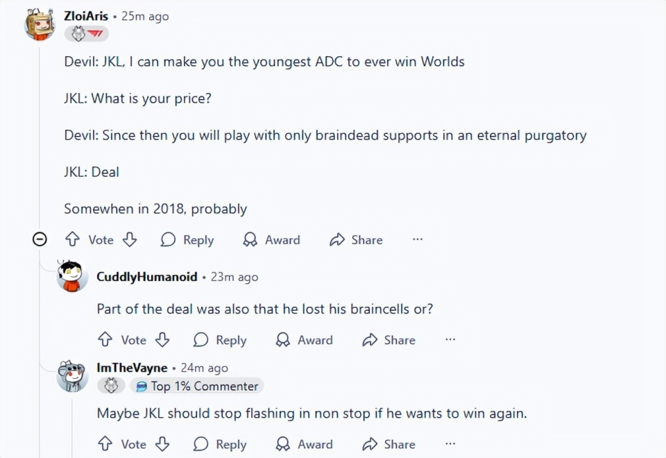 -大概在2018年的某个时候,魔鬼:JKL,我可以让你成为史上最年轻的世界冠军ADC。JKL:代价是什么?魔鬼:从此以后你就只能在永恒的炼狱里和脑残的辅助一起玩游戏。JKL:成交。