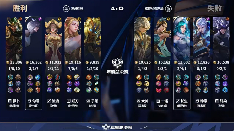众所周知,AG的王昭君加张良体系,这一局比赛前的胜率是100%,这个胜率终于被KSG打破了!赛前备受关注的妖刀和一诺,在对位上,第一局妖刀可以说是碾压一诺,超神的数据,非常华丽!