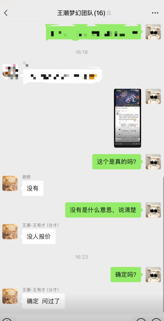 然后他们老王就问团队里的人,工作室的人说没人报价,大家觉得可能吗?我记得当时出的时候,群里的人就建议那个出无级别的老板去问问宝哥跟李总,他能不问,不可能的,大概率就是工作室的人不敢担责任,然后或者就是为了平息粉丝的言论吧!咱们先不管到底如何?