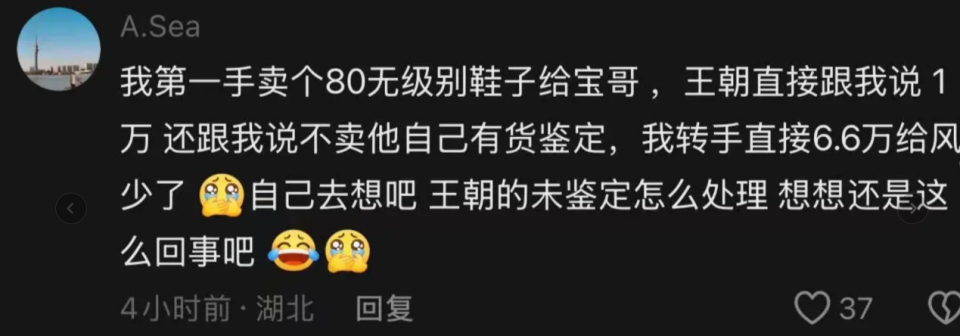 我总觉得王潮那边有鬼,他们每次都是不买粉丝出的东西都给出的结论是怕宝哥多花钱,卖东西就是怕给宝哥少卖钱,感觉上都是替宝哥着想,但是其实宝哥在哪里花了更多的钱去鉴定,就跟昨天一样,宝哥看弹幕很多人刷70级的简易的鞋子,宝哥问老王现在能鉴定70级鞋子吗?老王说现在只能强打,属性不好,结果又一通鉴定60级的。人家马头头都连麦说了三孔的好处,但是还是被他们一笔带过了!