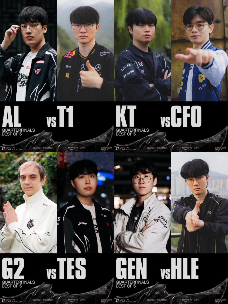 2025英雄联盟全球总决赛瑞士轮的所有比赛在25号晚上正式收官了,最终八支队伍成功晋级到了上海的淘汰赛阶段,他们分别是AL\T1\KT\CFO\G2\TES\GEN\HLE。而就在刚刚,八强赛阶段最重要的抽签仪式也结束了,最终的抽签结果如下: