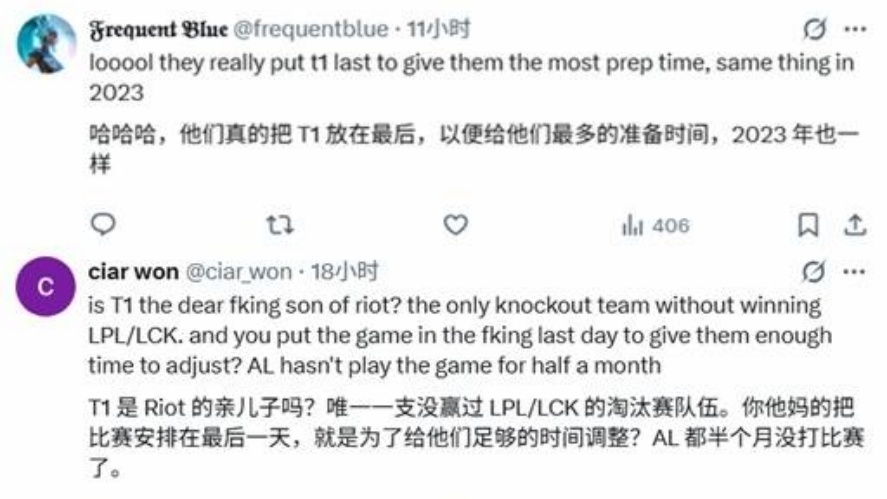 因为T1八强赛的比赛,被放到了最后一天,明明可以调整T1和AL的比赛,拳头非得调换半决赛,这一公告发出之后,拳头官号直接沦陷,无数玩家留言质问:T1是拳头的亲儿子吗?一支没赢过LPL、LCK的队伍,把比赛安排在最后一天,就是为了给他们时间调整?这样安排的依据是啥?