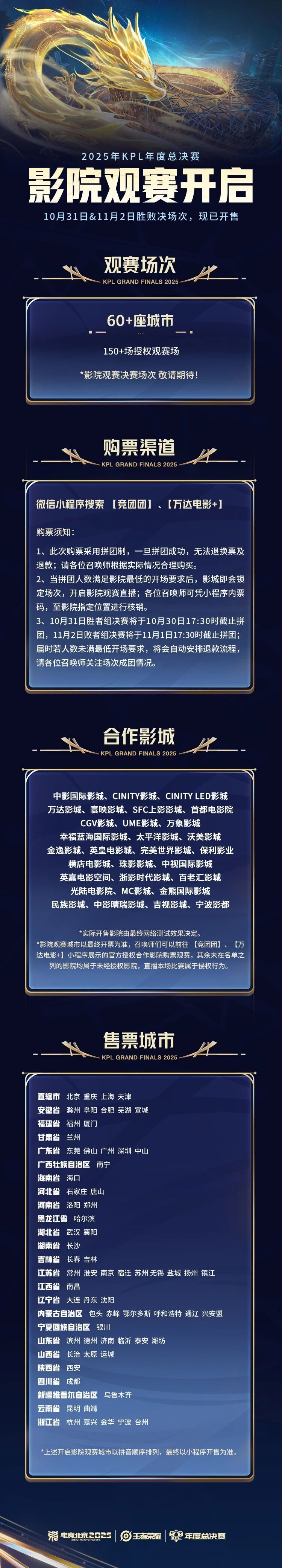 2025KPL年度总决赛胜败决即将热血开战!为了让无法来到现场的小伙伴体验到线下追竞的氛围,K妹将继续为大家带来KPL沉浸式影院观赛活动,在多个城市开设授权观赛点,集结同好为主队助威!另外,影院观赛决赛场次正在紧密筹备中,敬请期待!