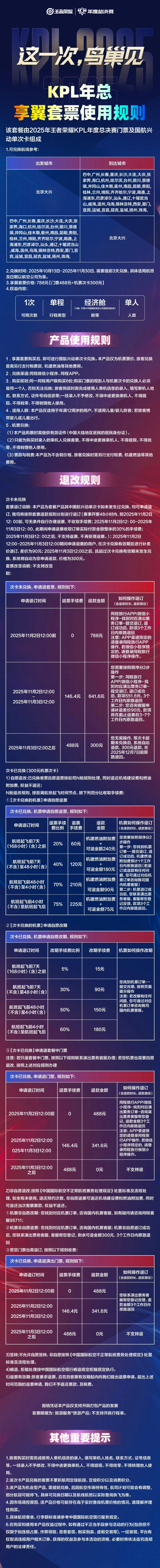 ✨KPL年总享翼套票:788元(门票488元+机票次卡300元),涵盖北京大兴往返多城航线,兑换时间2025年10月13日-11月30日,需要提前3天兑换,退改规则分次卡未兑换/已兑换两种情况(详见图示)