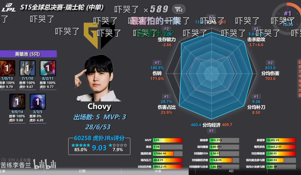 最恐怖的数据图应该是gen战队的中单选手chovy,基本上全方面的数值拉满了,分均补刀,分均经济,伤害占比,击杀助攻全部都排到了第一的位置,分均伤害,kda,生存能力排到了第二,只有伤害转化率稍低一点,但也高于平均的171.6,来到了180.9。上单位置中zeus也是非常出色的,是伤害拉满的选手,T1战队丢失他绝对是最错误的决策。所以al战队也不要过分担心,毕竟多兰的BO 5是有说法的,我们获胜的概率还是有的。