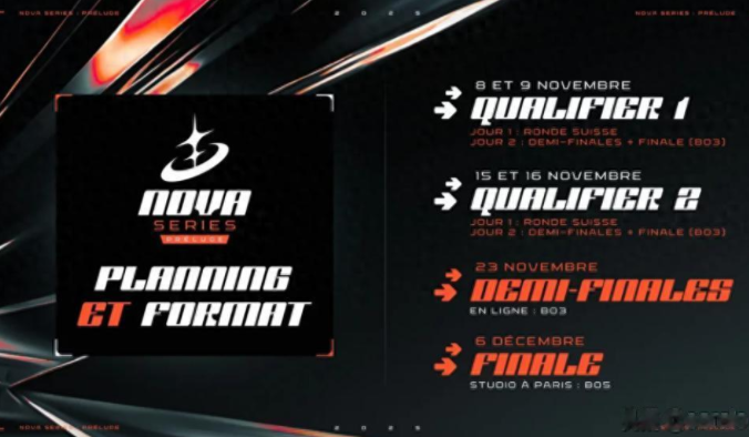 Nova系列赛将于11月至12月在欧洲举行,整体赛程紧凑而专业,赛事设有两轮预选赛,每轮为期两天。首日采用瑞士轮赛制,从众多参赛队伍中选出四支晋级队伍;次日则进行BO3单败淘汰赛,决出前两名晋级季后赛。两轮预选赛分别在11月8日-9日与11月15日-16日举办。