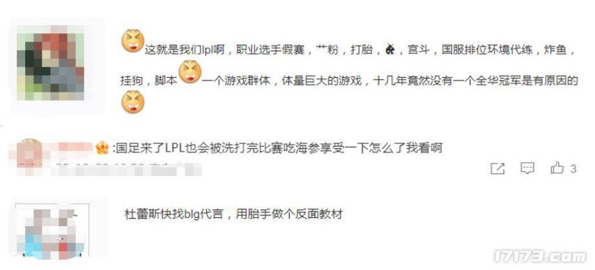 有怒其不争的网友吐槽,这就是我们的LPL,一款有着海量玩家的游戏,几十年来却没出一个全华班冠军,这是有原因的。此外国足躺枪评论区,有网友就表示,国足来了LPL也会变成这样,打完比赛吃海参享受一下怎么了?有商业头脑的网友建议说,让杜蕾斯快找BLG代言。