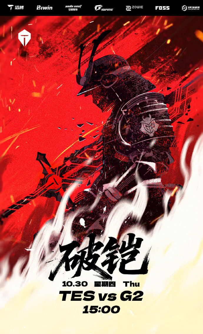 破铠!TES发布淘汰赛对阵G2海报,利剑穿胸破甲
