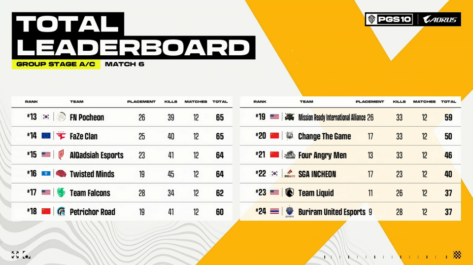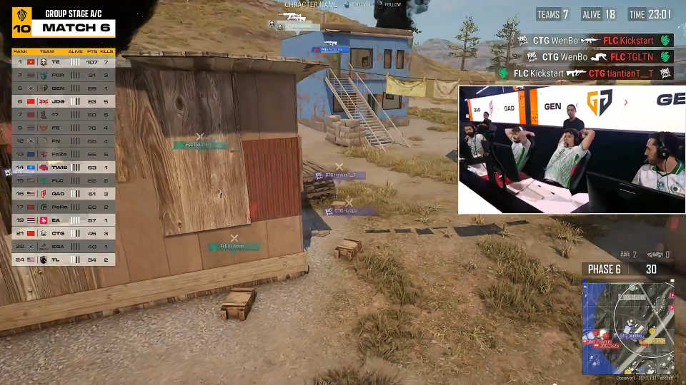 小组赛最后一场刷了个右下圈,TL前期想偷PeRo反被打掉一人,但绕低坡的XDD被对方逮到,Faze开滑翔机路过还把明明打倒,随着Faze其他人支援赶到以及FN劝架,PeRo仅拿2分就被淘汰出局。阶段5圈形刷新,17被JDG带走,FLC盲扎到了CTG的房区,最后的4清2的残局还被FLC换了两个,这波真不应该,并且FLC拿到淘汰分后排名也反超了PeRo。