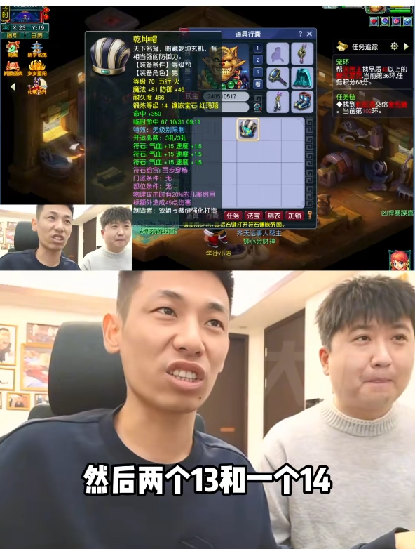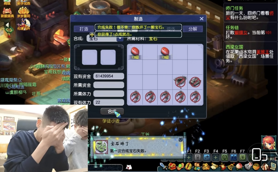 然后宝哥又用剩下的两个13级的宝石,最终合出来服务器第一个14级的红玛瑙,但是宝哥忘记了宝石要一级一级往上打,还差一个13级的才可以上到14级,就让老王抓紧在他下播之前再弄一个13级的!