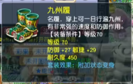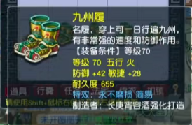 70级的鞋子,防御+42,敏捷+29,特效是流云诀!