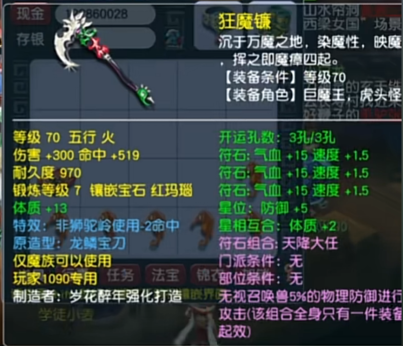 70级的高伤武器,伤害+300,命中+3344,体质+13,切造型切的非专用武器!满伤害也是齐天大圣首屈一指的武器了!