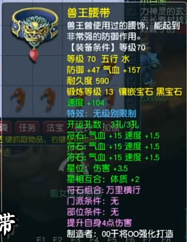 然后就是让粉丝最为诟病的就是这个无级别腰带了,防御+47,气血+157,然后打了13段的黑宝石,粉丝们都觉得无级别腰带上了这么高段的宝石后期不好卖,宝哥考虑的是好不好卖?是能不能赢,这个很重要,现在的宝哥已经不是刀把哥了,已经变身刀把帝了,哈哈。