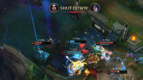 巨大劣势之下,AL没有退路选择和T1硬碰厄塔汗团战,结果T1第一时间开团强杀飞机,但T1交掉了大量技能,后续的拉扯团战中AL逮住Faker完成击杀,铁男关大招击杀Oner,又成功击杀卡莎,一波反击团战大胜,将劣势缩小到两千多。