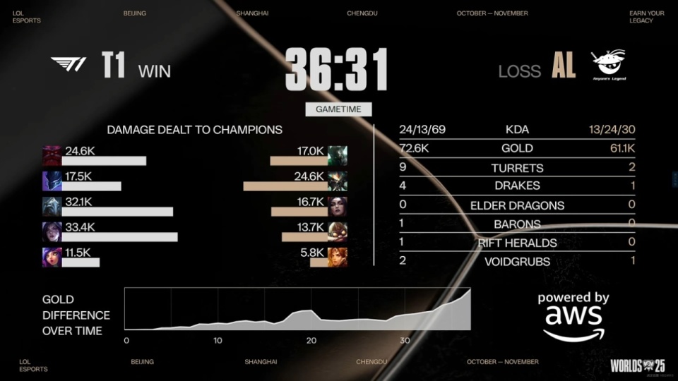 开局阶段T1三路都拿到线权,AL下路第一波换血是比较亏的,但后面女坦抓机会先手拼线杀逼出了Gumayusi的双召。