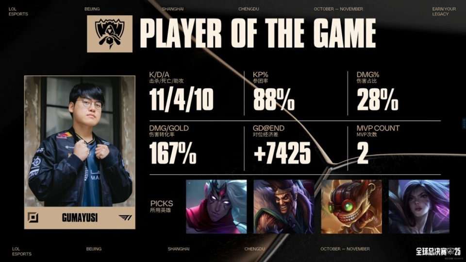 个人认为这局T1算是绝境破魔咒了,Gumayusi重压之下掏出卡莎并且拿下四杀,成功发挥作用,比赛层面上最大功臣是Doran,上路一波回城诡计骗到AL成功拿下一波2换4开始滚起雪球。
