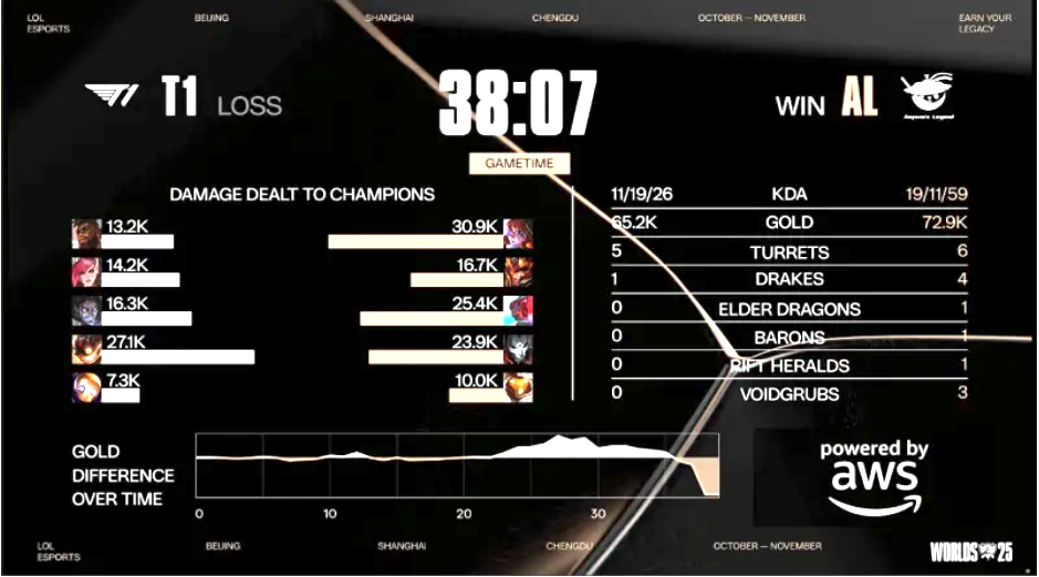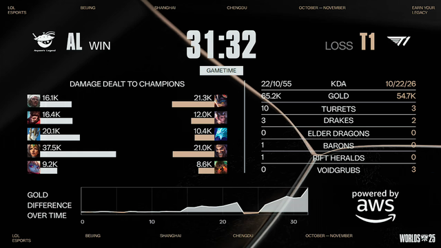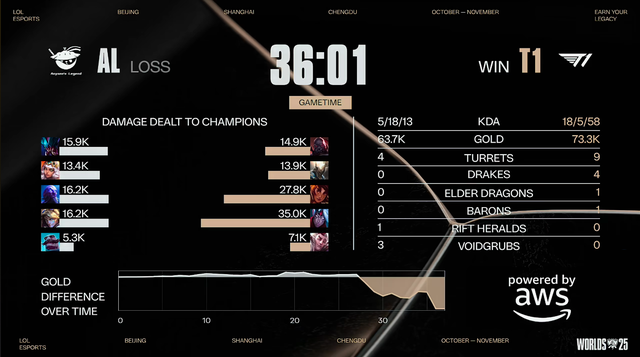 结果第一局比赛,双方各打了半场好局,T1笑到了最后。前15分钟,AL领先1000的经济优势。但是16分钟左右,Doran塞恩吸收大量伤害,T1团战控制链拉满完成2换4;18分钟左右,Flandre雷克赛突然杀出,AL众人一拥而上击杀Faker;21分钟左右,AL下路双人组率先被秒,Tarzan关键大招AL及时止损;27分钟左右,T1完美团战阵型,逐个击破完成团灭随后拿下龙魂与大龙;29分钟左右,T1巨大优势推进,Gumayusi火龙魂韦鲁斯轻松拿下双杀;最终36分01秒,T1团灭AL,先赢一局。