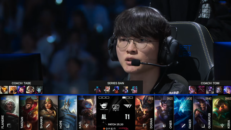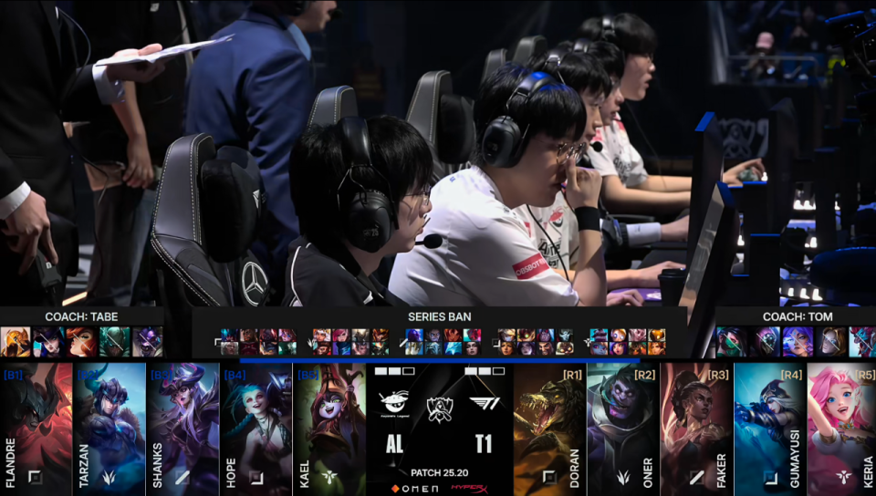 第一局比赛,AL蓝色方,禁用:巴德;沙皇;妮蔻;波比;牛头,选用:Flandre雷克赛;Tarzan奇亚娜;Shanks瑞兹;Hope伊泽瑞尔;Kael布隆;T1红色方,禁用:巨魔;芸阿娜;发条;炸弹人;希维尔,选用:Doran塞恩;Oner潘森;Faker岩雀;Gumayusi韦鲁斯;Keria洛